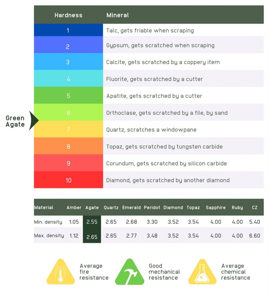 Regarding technical characteristics, the physical and chemical properties of agate are similar to those of quartz and other stones from the family of chalcedonies.