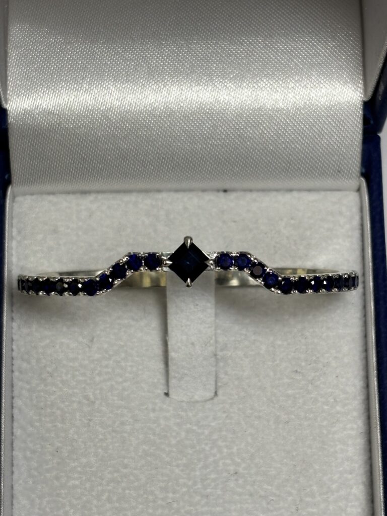 La seconde, plus graphique, est une bague double traversant deux doigts, montée d’un saphir princesse et d’un pavage de corindons synthétiques saphir bleu foncé ronds provenant de la boutique en ligne Dalloz Stones & Rough.