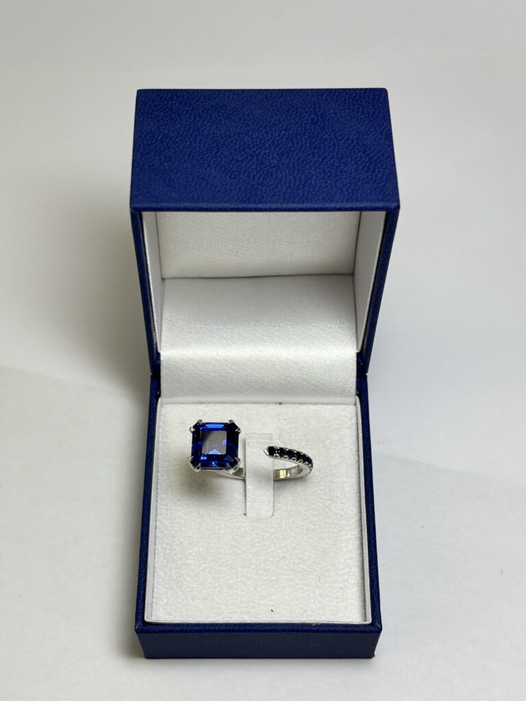 La première est une bague ouverte, centrée sur une tanzanite et sertie de petits saphirs synthétiques pour en renforcer la profondeur.